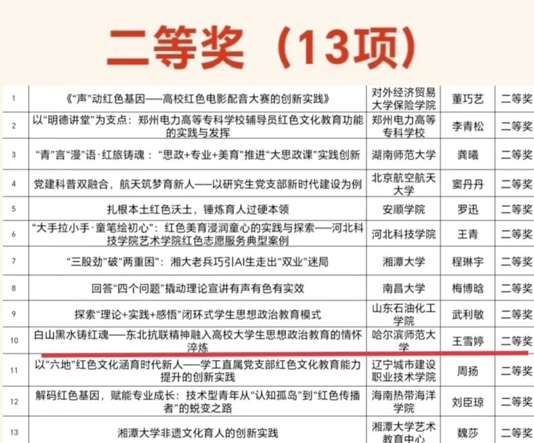 近日,由教育部高校思想政治工作队伍培训研修中心(湘潭大学)举办的高校思想政治工作优秀案例征集活动结果公布。我校文学院辅导员王雪婷凭借扎实的工作实践与创新的育人方法,其申报的《白山黑水铸红魂——东北抗联精神融入高校大学生思想政治教育的情怀淬炼》获评"优秀案例"二等奖。