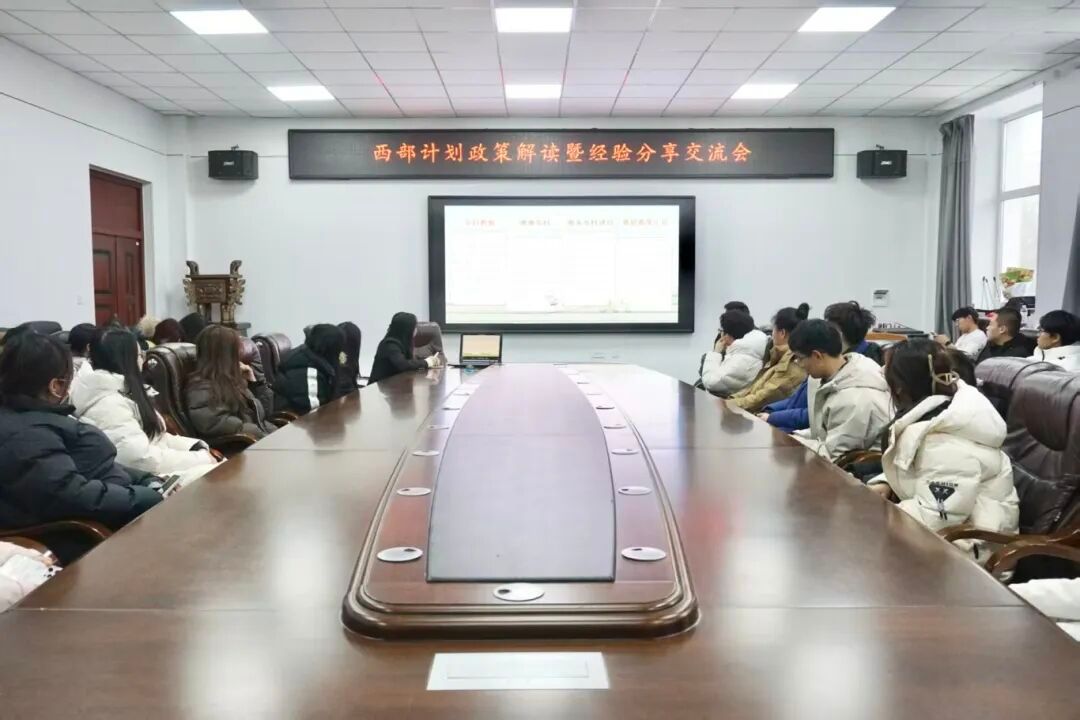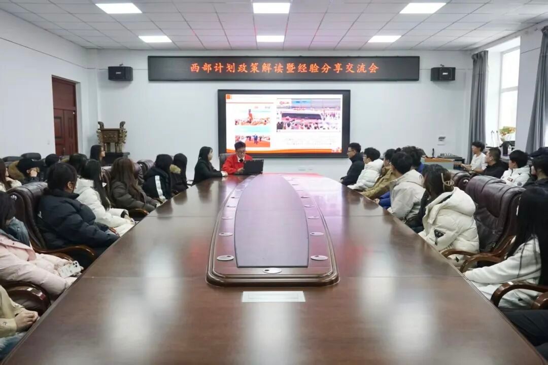 为深入学习贯彻习近平新时代中国特色社会主义思想,贯彻落实国家基层人才发展战略,引导青年在服务国家战略中实现人生价值,以实际行动助力西部计划战略实施。文学院于2025年12月2日14:00在人文楼206室举办西部计划政策解读和经验分享交流会,本次西部计划政策解读和经验交流分享会由2025届优秀毕业生陈盈涵和章敏进行分享,文学院团委书记刘建鹏出席并主持本次会议。