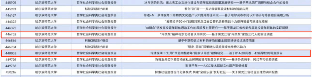 我院由2023级汉语言文学专业陈新岩同学负责的《冰与诗的交响:文学叙事视角下哈尔滨冰雪文化传承创新研究》项目,由2024级汉语国际教育专业尹卓然同学负责的《语众不同·美美与共——黑龙江世居民族语言文化现状的田野调查与活态传承的数字路径》项目荣获省赛二等奖;由2023级汉语言文学专业郭睿淼同学负责的《“闯关东”精神与东北社会认同研究——基于黑龙江“闯关东”三代人的实证调查》项目,由2023级秘书学专业游瑞阳同学负责的《传播视阈下“红歌”文化助推青年“国家认同感”建构研究——基于8146份问卷、42所学校的调查》项目荣获省赛三等奖。