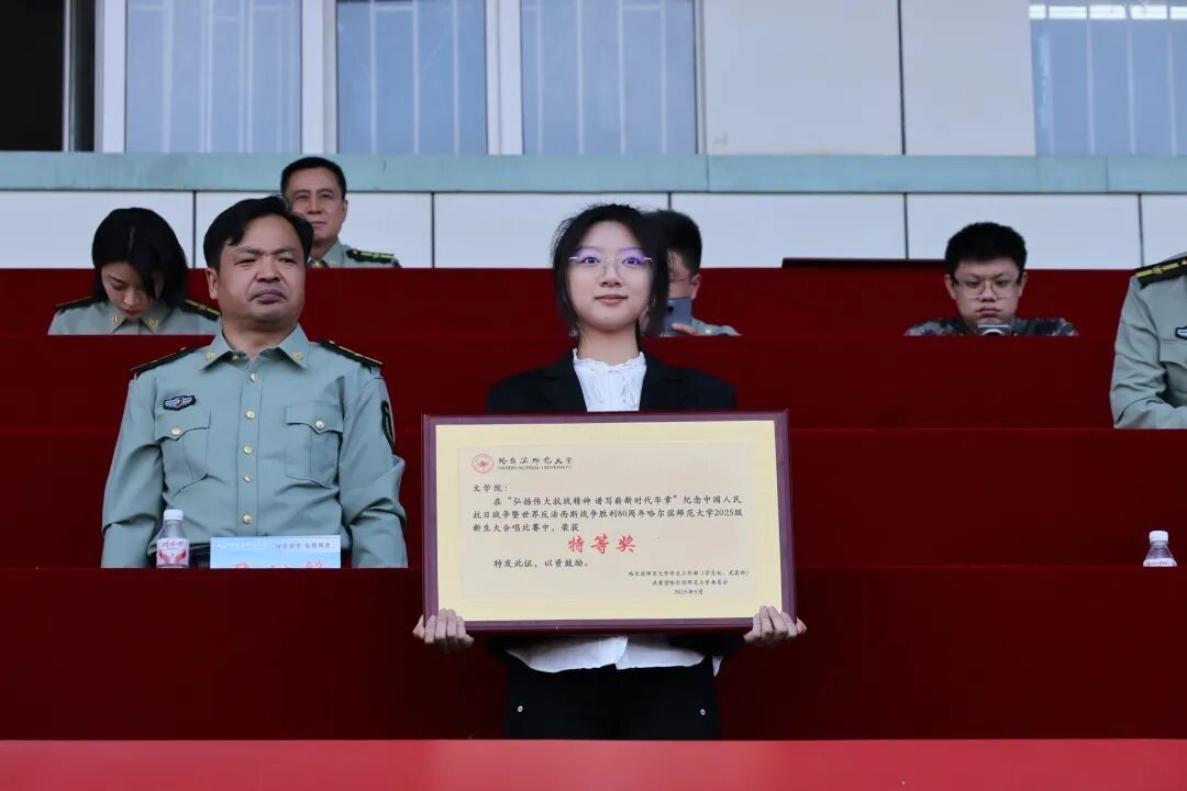 在2025级新生军训各项评比中,文学院凭借出色表现斩获多项荣誉,先后荣获“军训优秀组织单位”“新生大合唱比赛特等奖”以及“优秀连队”等多项集体荣誉称号,多名新生获评“军训先进个人”。一张张荣誉证书、一帧帧合影定格,不仅是对军训成果的充分肯定,更彰显了文院学子团结一心、勇于争先的精神风貌。